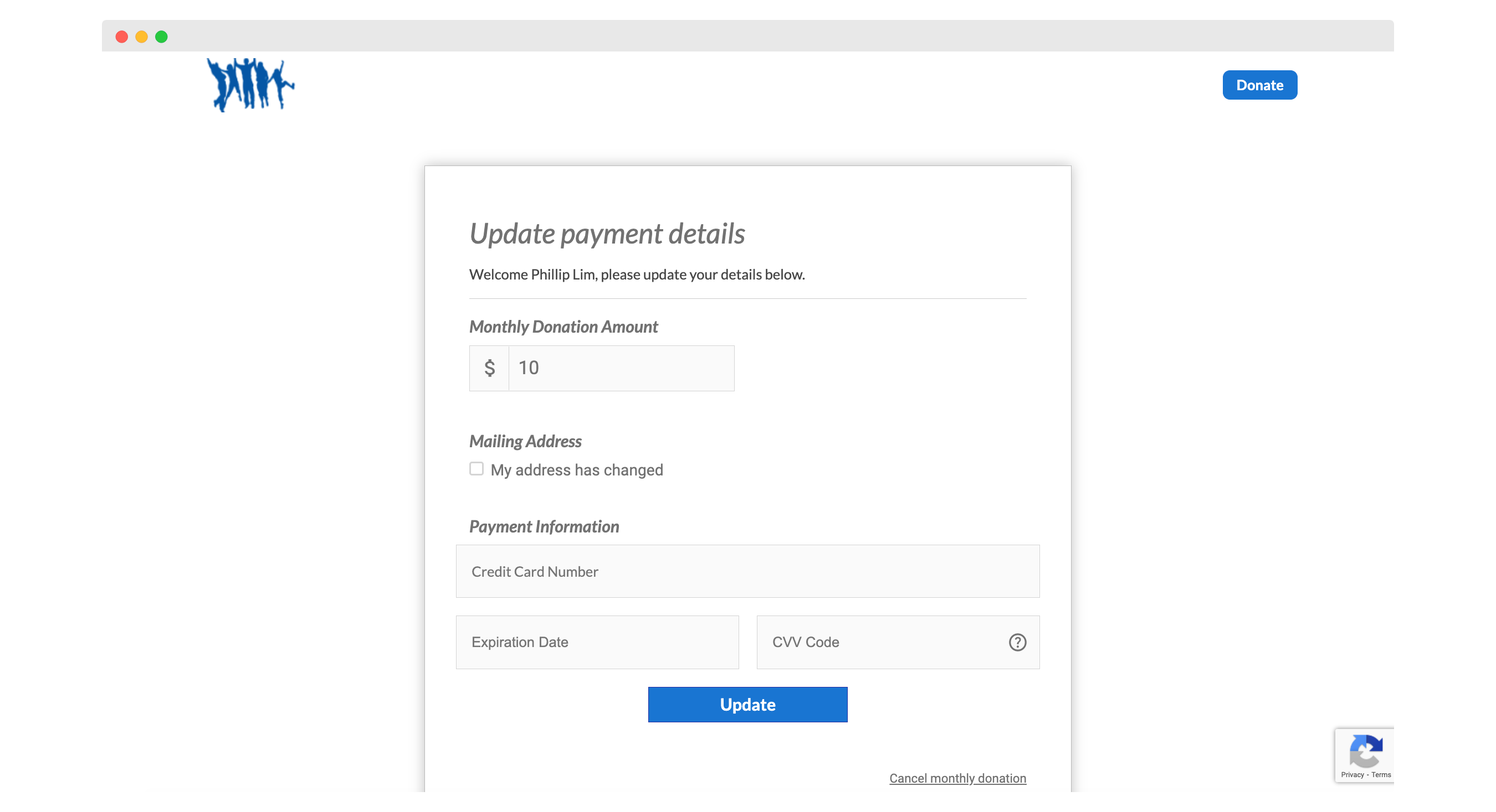 Unexpected changes to your supporters' card details can interrupt their recurring donation schedules. Upon accessing the portal via their unique link, your donors are able to quickly enter their new card information and submit for automatic re-processing.